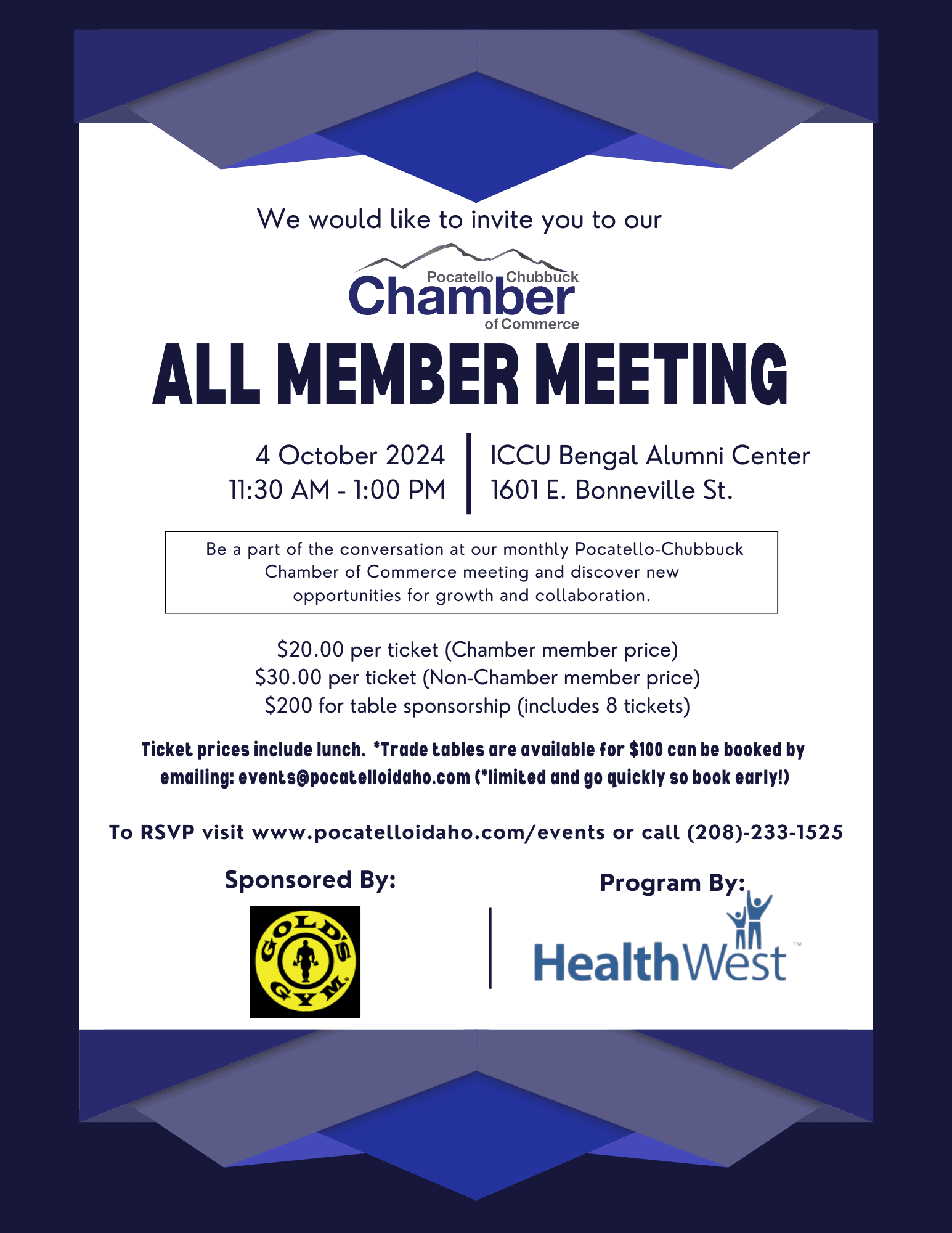 Please join us on Friday, October 4, at the ICCU Bengal Alumni Center for our All Member Meeting. The sponsor for October is Gold's Gym and our program is Health West. We open check-in and the Trade Tables at 11:30 am. Lunch and the meeting will begin at noon. Cost of attendance is $20 for members and $30 for non-members. If you wish to attend, please register by calling our office at 233-1525, or visit our website at www.pocatelloidaho.com. When you register, you can choose to be invoiced or you can pay by credit card. Please note, no walk-ins. You must register before the lunch to attend.