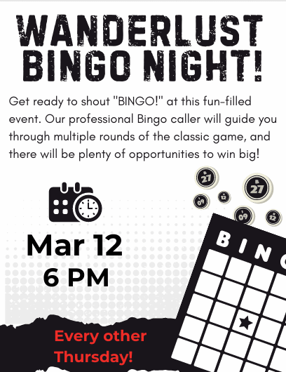 Bingo every other Thursday at Wanderlust. Come early to get a spot! Cards start selling at 6pm and games start at 6:30pm.