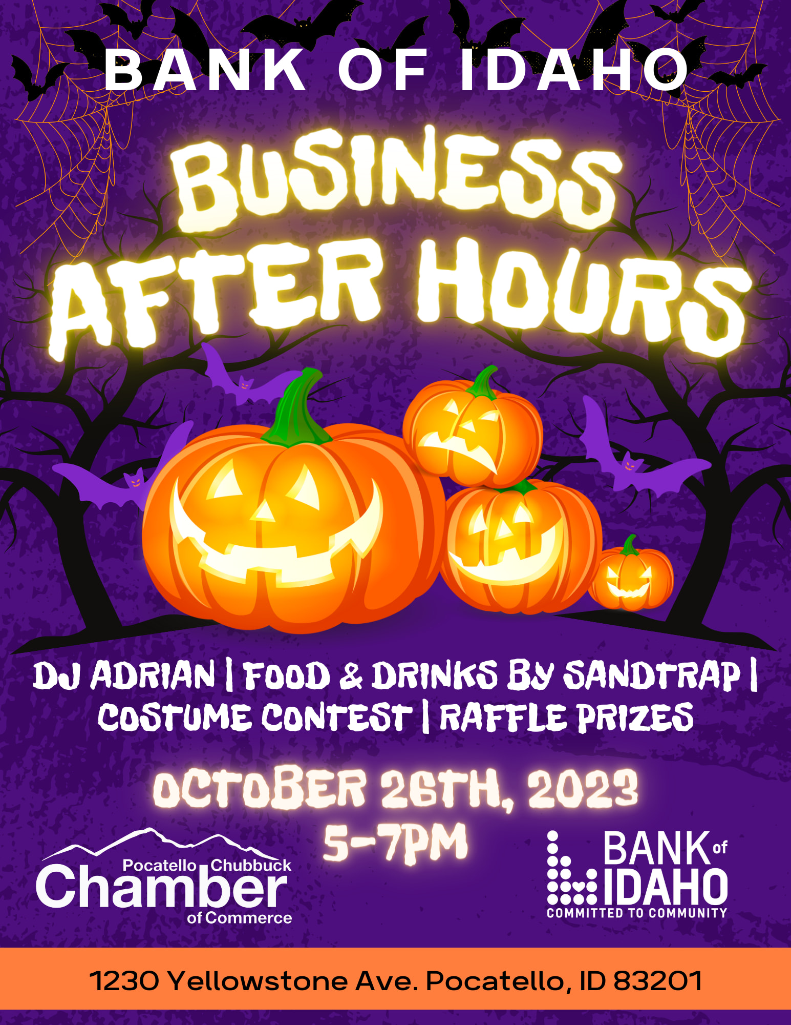 Business After Hours is a great way to highlight your business, promote your events and make connections in the community. This month is hosted by Bank of Idaho on October 26, 2023 from 5-7pm. Located at 1230 Yellowstone. Don't miss this fun night of networking with complimentary food and drinks catered by Sand Trap, music by DJ Adrian, a costume contest and raffle prizes!