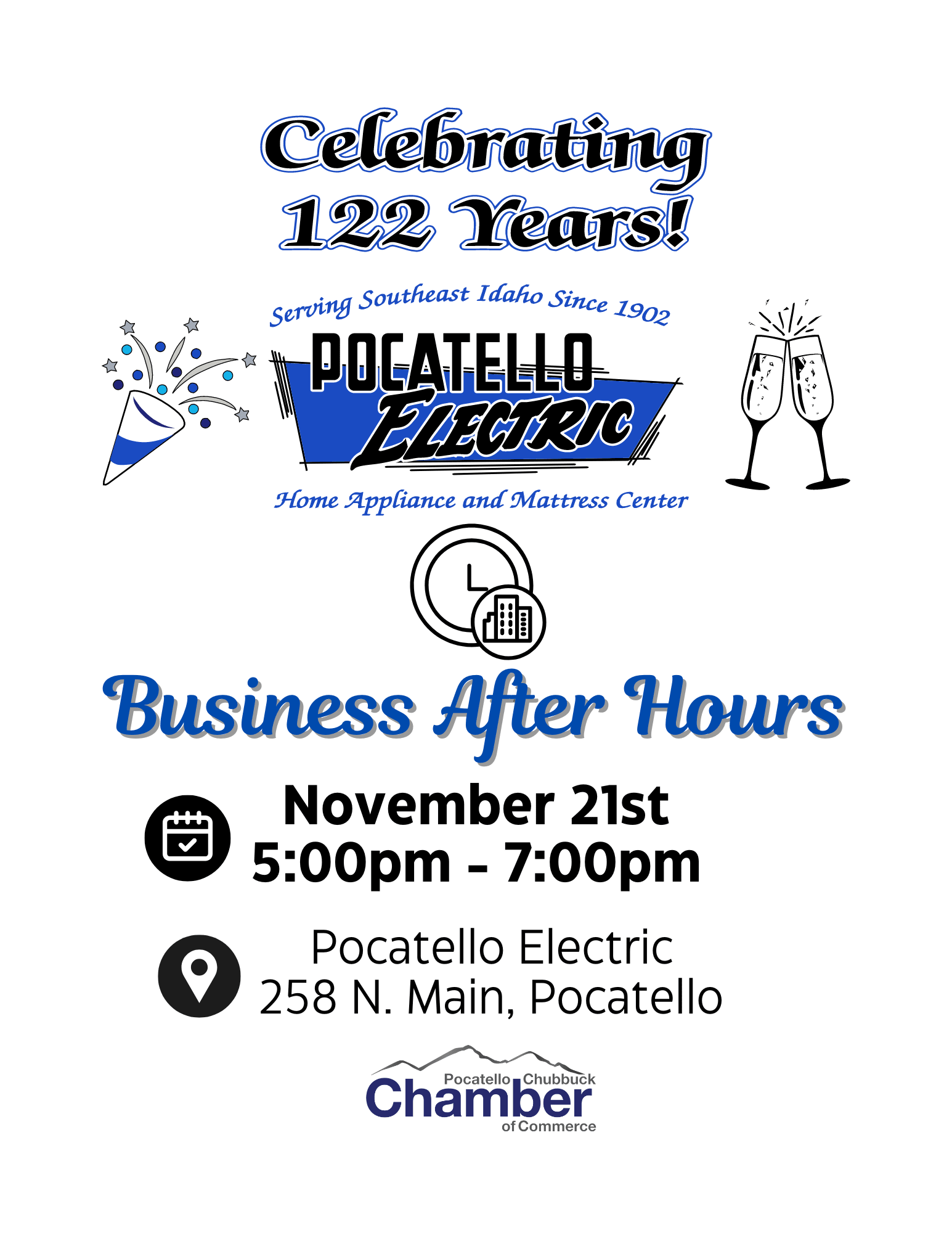 This month's Business After Hours is hosted by Pocatello Electric on November 21, 2024, from 5-7pm. Located at 258 North Main Street in Pocatello. Complimentary food and drinks will be provided by Pocatello Electric. Don't miss this great networking opportunity!