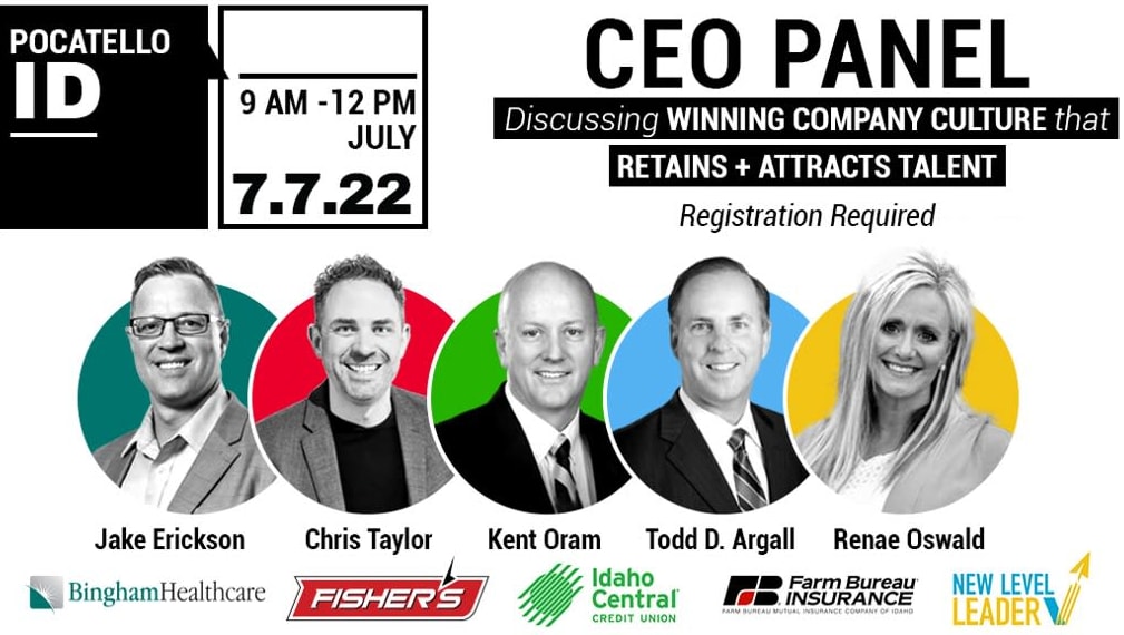 Panelists include Jake Erickson, CEO of Bingham Healthcare, Chris Taylor, CEO of Fisher’s Technology, Kent Oram, CEO of Idaho Central Credit Union, Todd D. Argall, CEO of Farm Bureau, and the moderator, Renae Oswald with New Level Leader. The reception will begin at 9 a.m. with pastries and coffee being served. The panel discussion is from 10 a.m. – 12 p.m. Registration is required due to limited seating.
