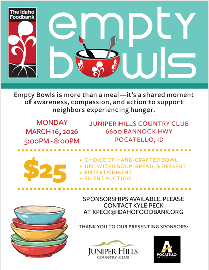 Empty Bowls is a community event that brings people together over a shared meal of soup and bread to raise awareness and funds to fight hunger. Guests select a handcrafted bowl as a reminder that many of our neighbors face empty bowls every day. At The Idaho Foodbank’s Empty Bowls event, 100% of the proceeds directly support hunger relief efforts across Eastern Idaho, helping provide nutritious food to individuals and families in need. The event offers a meaningful way for the community to connect, give back, and be part of the solution to food insecurity.