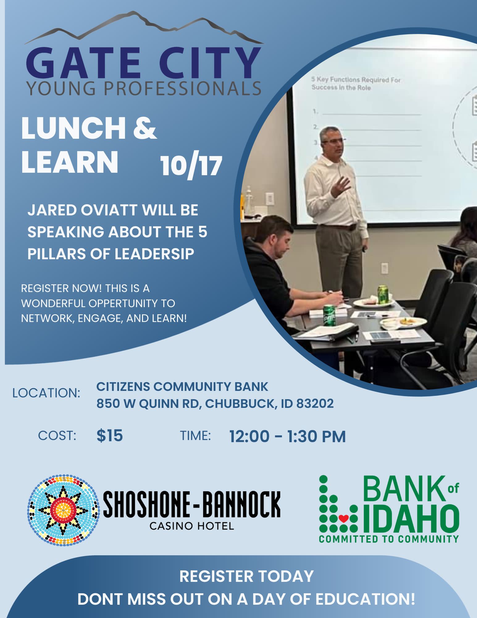 We will be hearing from Jared Oviatt about the 5 pillars of leadership. We will be meeting at Citizen's Community Bank in their conference room. Tickets are $15 each.