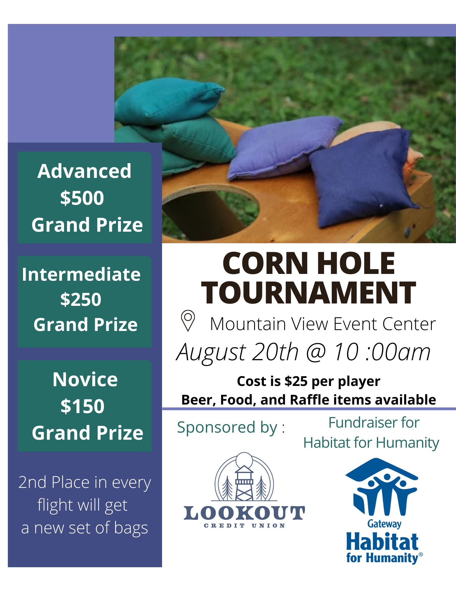 Gateway Habitat for Humanity and Lookout Credit Union are hosting our FIRST ANNUAL Cornhole Tournament fundraiser! The tournament will be located at the Mountain View Event Center located at 1567 Way to Grace Ave. Pocatello ID 83201. AUGUST 20TH, starting at 10:00AM There will be 3 divisions for players. Competitive division wins $500 for first place, Intermediate gets $250, and Novice wins $150! Second place in all divisions wins a new set of Cornhole Bags. *All prizes are being generously donated by Lookout Credit Union. * There will be food, drinks, and LOTS of raffle items! Our current list of sponsors supplying raffle items are: Cole Chevrolet, Hirning, Nissan/Kia, Idaho Nutrition Now, Legit Boards, The MEC, Fellows Family Dental and many more! Sign-up on the Scorholio app, on our website at gatewayhabitat.org, or on the MEC's website.