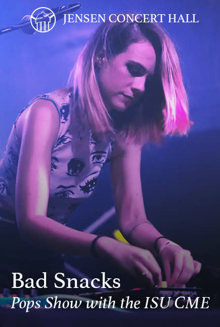 DJ/vocalist/violinist/composer, Bad Snacks, joins the ISU Commercial Music Ensemble and the ISCS for a genre-blurring show full of warmth, rhythm and imagination. Known for her signature blend of strings and synths, Bad Snacks describes her style not as "house" music, but "home" music -- comforting, personal, and deeply human. Her playful sound transforms life's messy moments into grooves that move both body and soul.