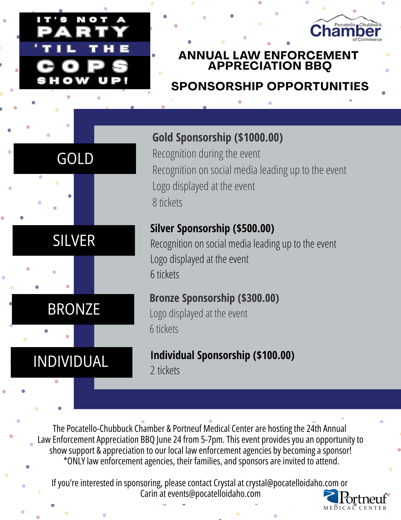 Pocatello-Chubbuck Chamber is hosting the 24th Annual Law Enforcement Appreciation BBQ sponsored by Portneuf Medical Center. Tuesday, June 24 from 5:00-7:00 pm. This event provides local businesses an opportunity to show their appreciation to our local law enforcement agencies!