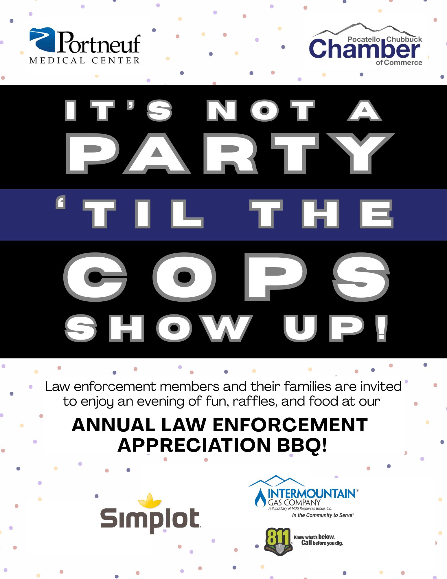 Pocatello-Chubbuck Chamber is hosting the 24th Annual Law Enforcement Appreciation BBQ sponsored by Portneuf Medical Center. Tuesday, June 24 from 5:00-7:00 pm. This event provides local businesses an opportunity to show their appreciation to our local law enforcement agencies!