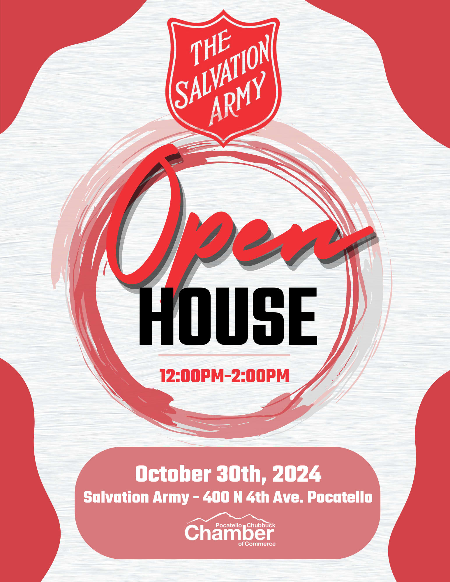 Open House hosted by Salvation Army 12pm - 2pm on October 30, 2024. Located at 400 N 4th Ave in Pocatello. Don't miss this opportunity to network! Take a tour of Salvation Army and become familiar with the great things they do for our community! Complimentary food will be provided by Salvation Army.