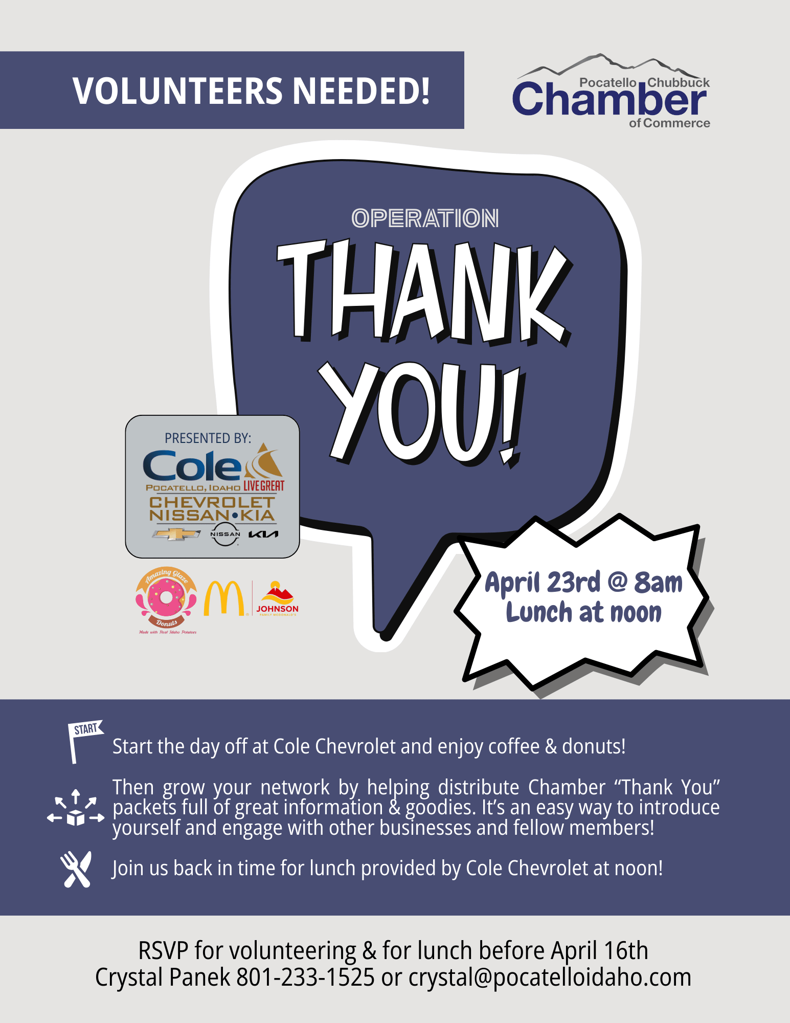 "Operation Thank You" is our way of expressing gratitude to our Chamber members for their continued support and involvement. Join us bright and early at Cole Chevrolet as we distribute Thank You packets to our valued members in Pocatello and Chubbuck. This is a great opportunity to network while personally delivering packets to local businesses and showing our appreciation for their membership!