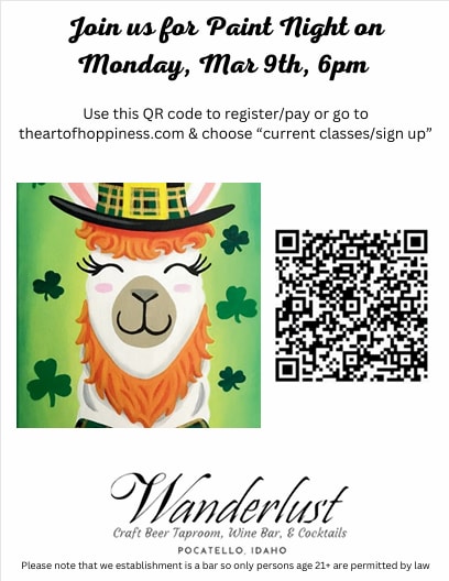 Come paint a fun St. Patty's Day masterpiece and enjoy your favorite adult beverages while you paint! We have craft beer, wine, specialty cocktails, and several non-alcoholic options as well. You will receive all of the supplies and step-by-step instructions. Use QR code to sign up through The Art of Hoppiness.