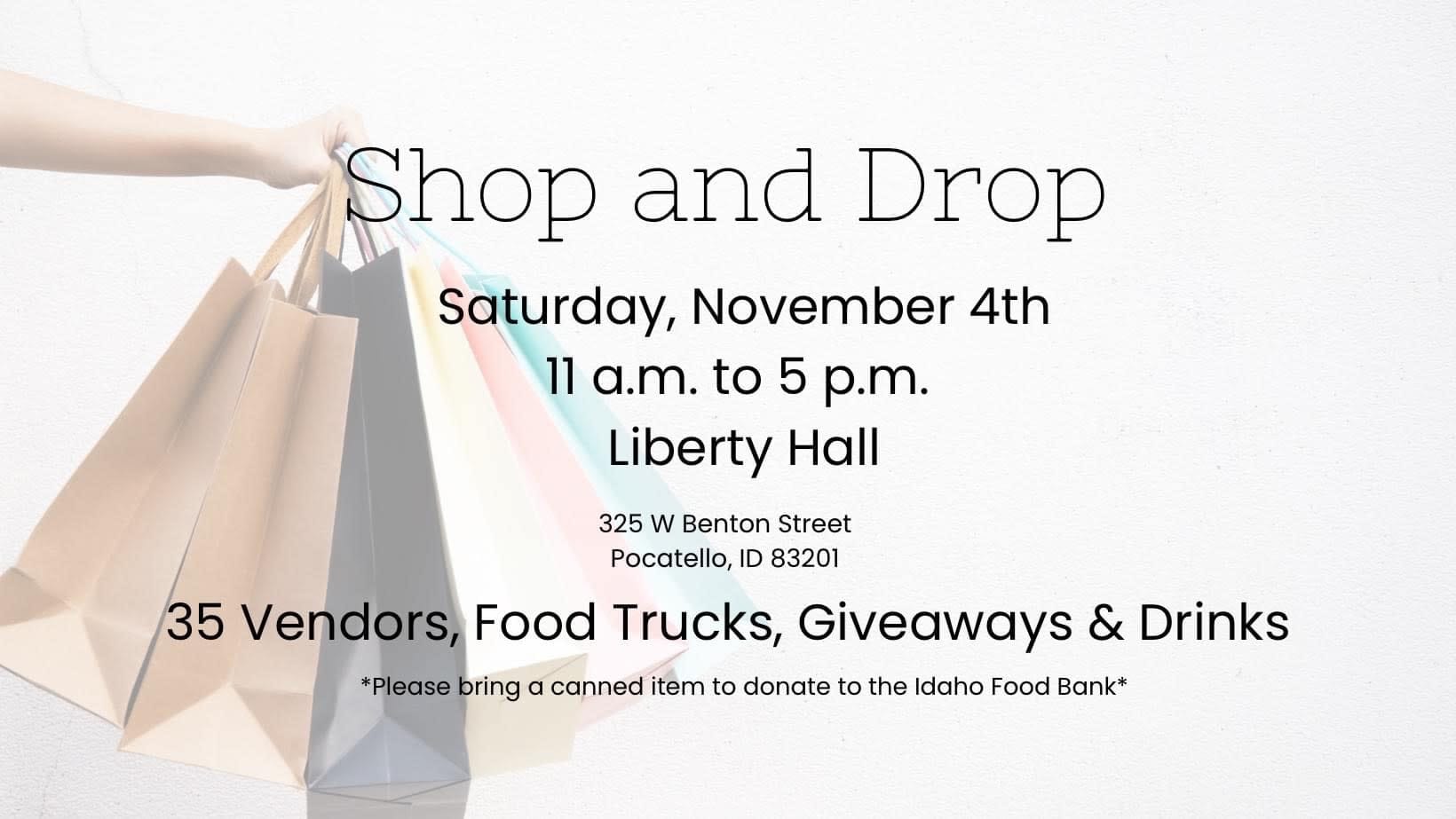 Shop with over 30 local vendors! Please support our local artisans while having a fun day out on the town with friends! We have many vendors, food trucks, giveaways, and drinks! We also have an opportunity to give back to our community through this food drive for the Idaho Food Bank! Please bring a non-perishable item, friends, and let's have some fun!