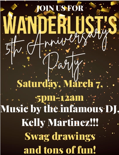 Wanderlust has been in business for over eight years. This March 1, 2026, represents 5 years since Kevin and Jeni bought the business. Come celebrate 5 wonderful years with us! Swag drawings and DJ Kelly Martinez!